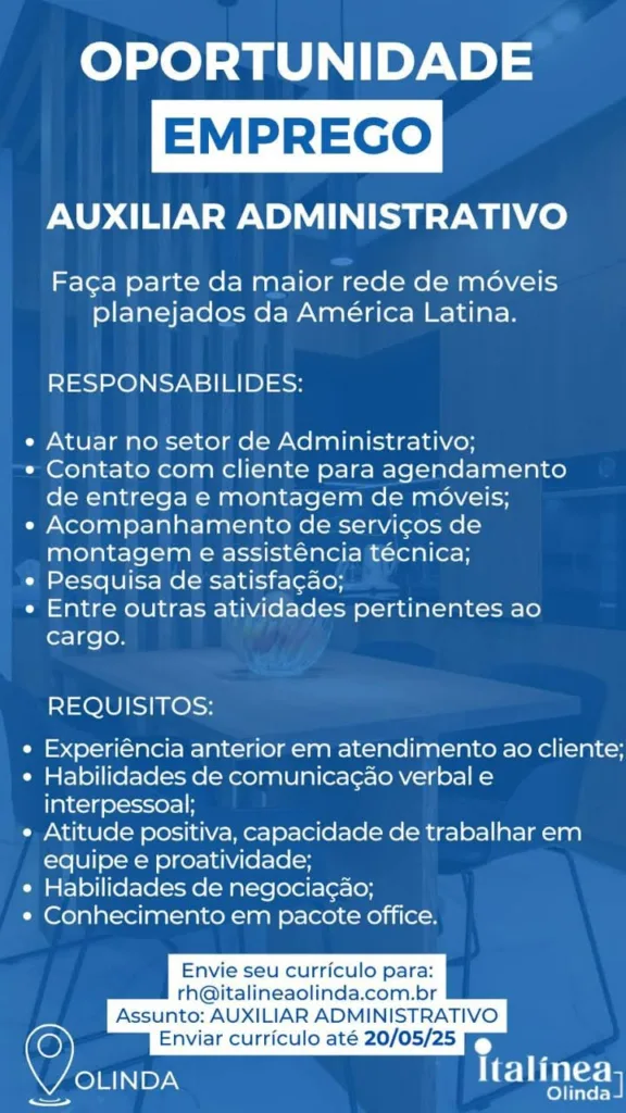 Vaga para Auxiliar Administrativo – Italínea Olinda